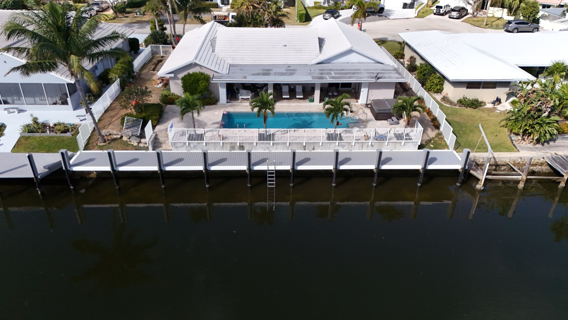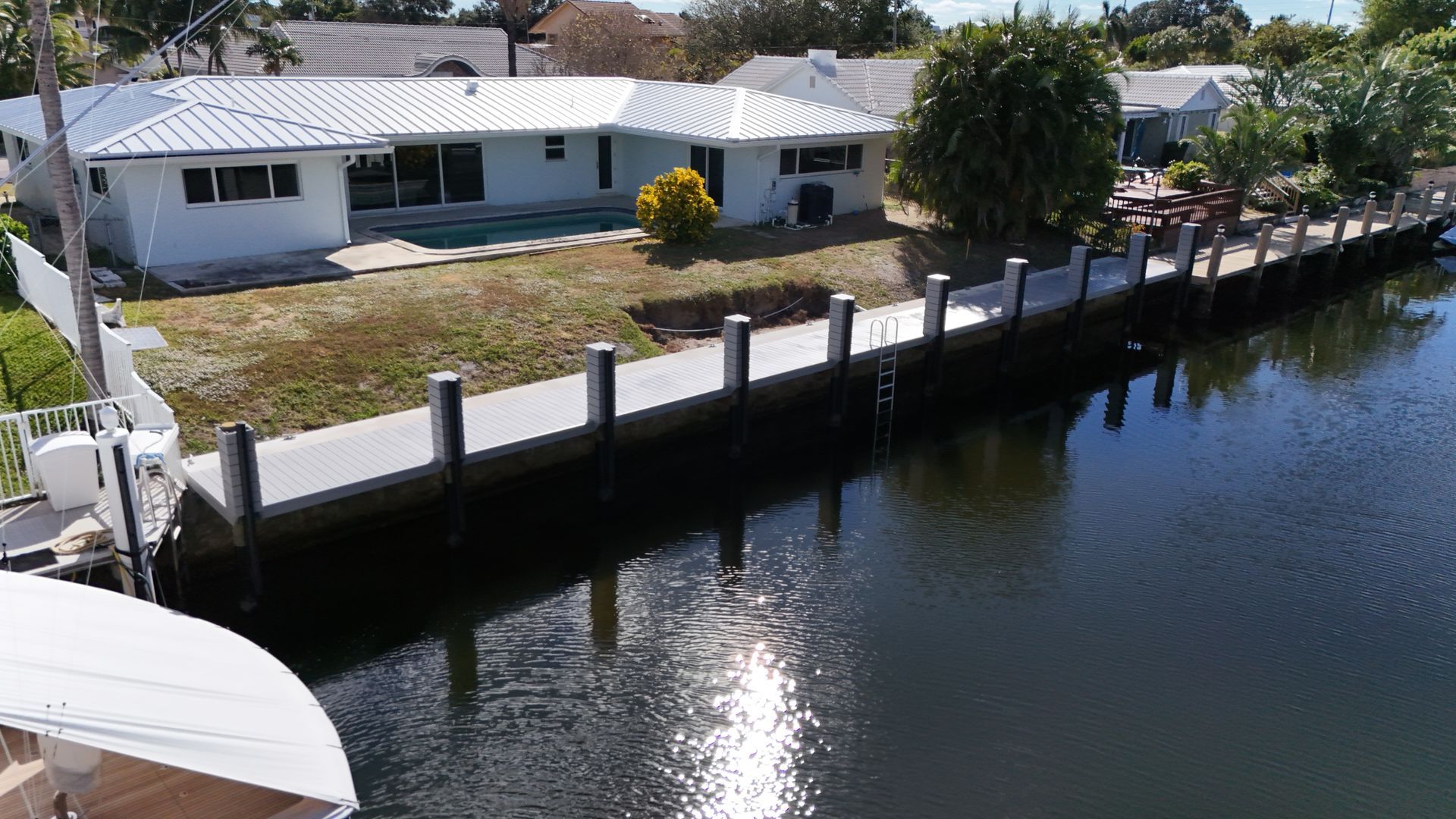 The dock structure also incorporated MST reinforcement, ensuring long-term durability and resistance to the harsh saltwater environment typical of South Florida. This combination of modern materials, thoughtful engineering, and elegant design results in a dock that is both visually striking and built to last.