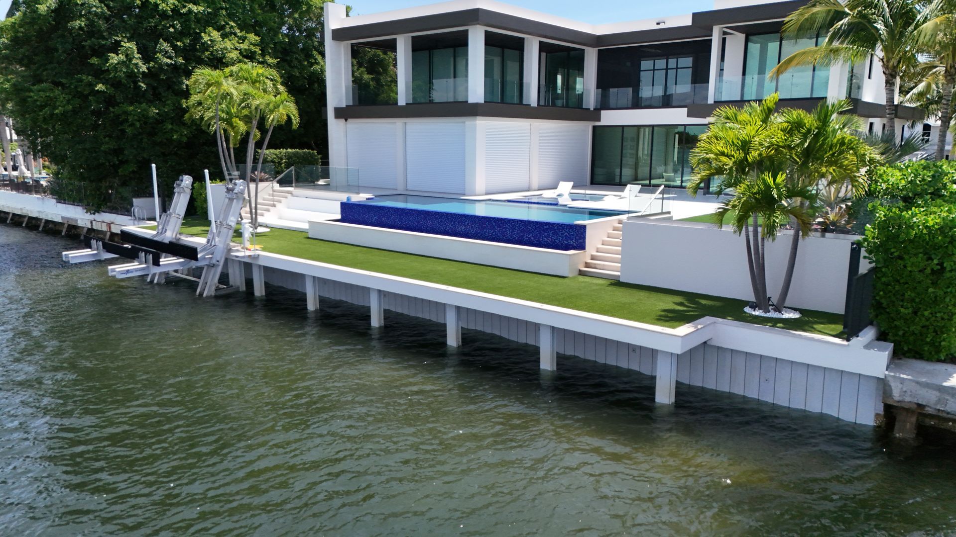 Additionally, subsurface conditions revealed a consistent rock layer approximately 5 feet below the mud line. Based on the project’s geotechnical soil report, each seawall panel was engineered and pinned directly into the rock layer, providing enhanced structural stability and long-term shoreline protection. This intentional engineering approach ensures the seawall performs reliably under South Florida’s demanding coastal conditions.