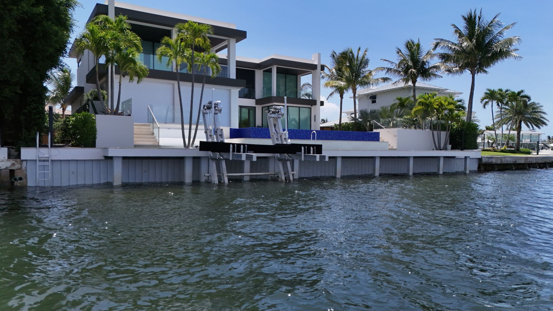 This Ocean Ridge, Florida waterfront project was completed as part of a new residential construction, allowing our team to design and install critical shoreline infrastructure before the home and landscaping were finalized. The scope of work included the installation of a new Truline Hybrid Seawall system, a concrete dock, and coordination of a 27,000 lb G6 Neptune Boat Lift, all executed in close collaboration with the general contractor.
