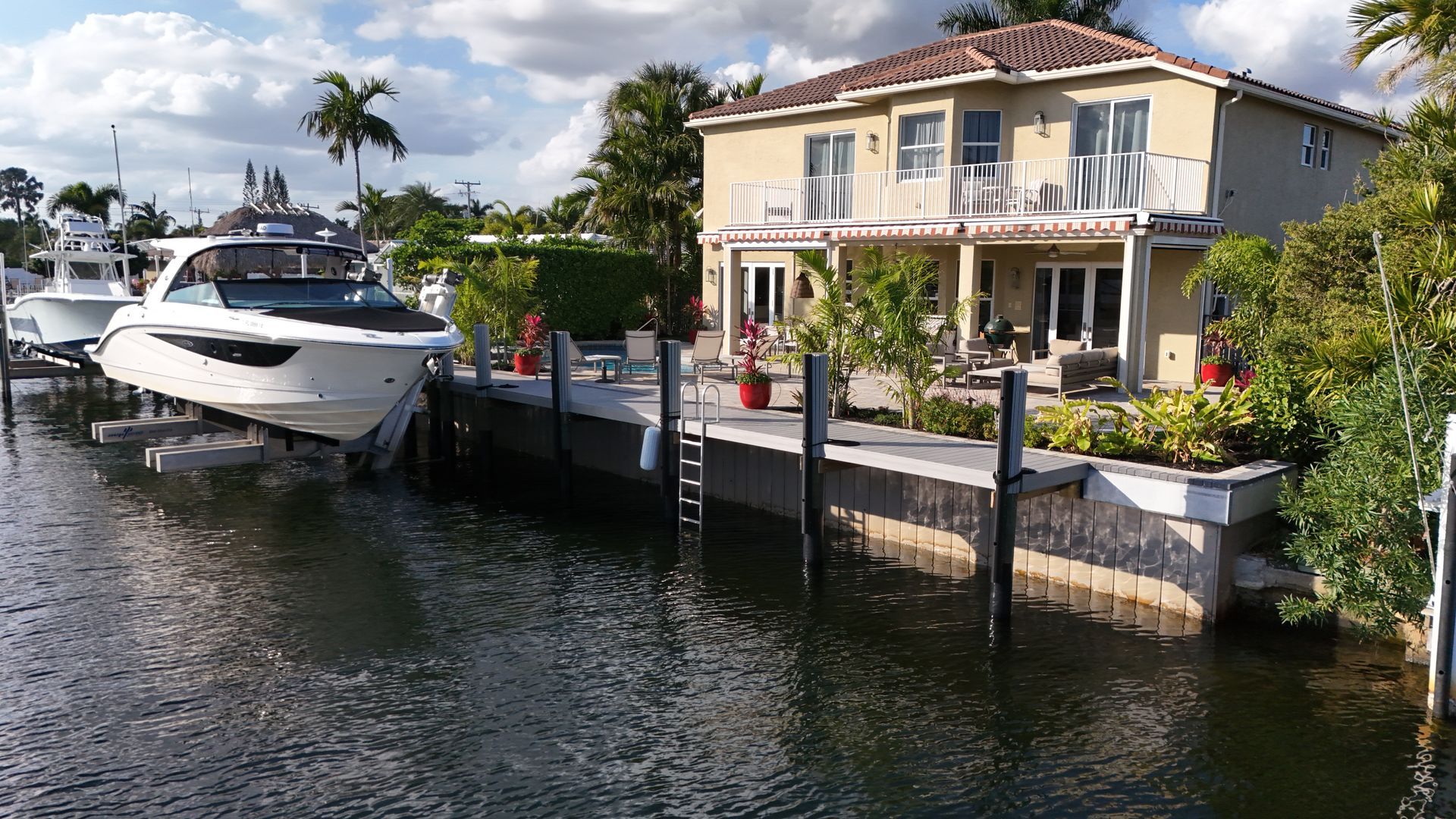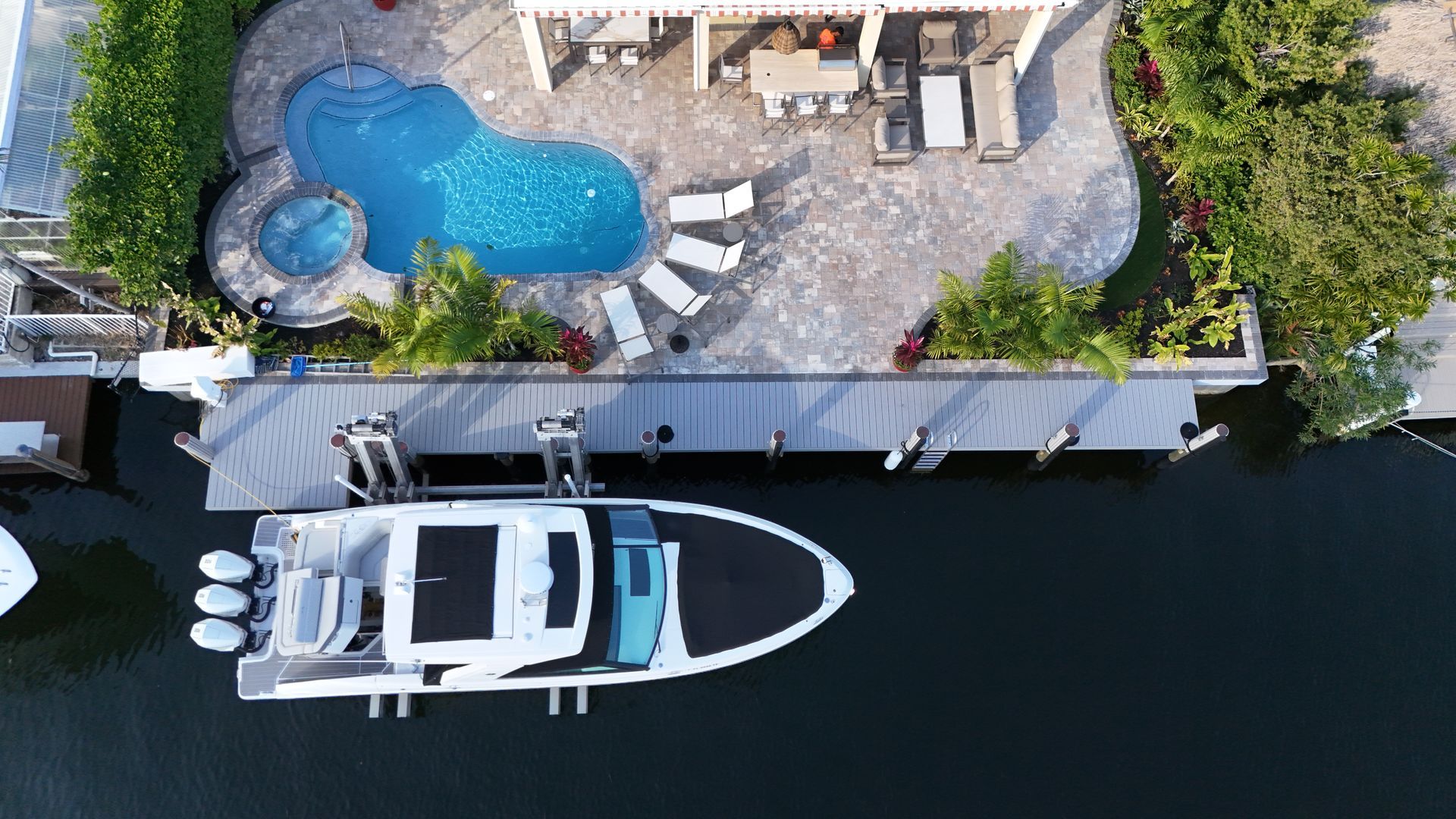 The dock was constructed using WearDeck decking from Decks & Docks, framed with marine-grade lumber and secured with 316 stainless steel hardware, providing a durable, low-maintenance surface built to withstand saltwater conditions. To complete the waterfront solution, we installed a 33K Neptune quad-track boat lift with a custom boarding platform seamlessly integrated into the dock for both function and aesthetic appeal.